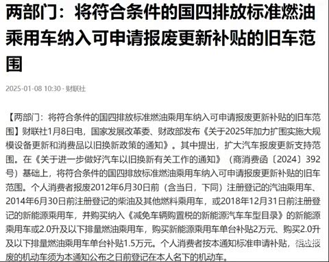 2025年,国四燃油车被列入报废补贴范围啦,而且补贴可用范围进一步扩大!这一政策宛如投入车市的巨石,今天咱们就来深入剖析一番,让你及时了解新政策。