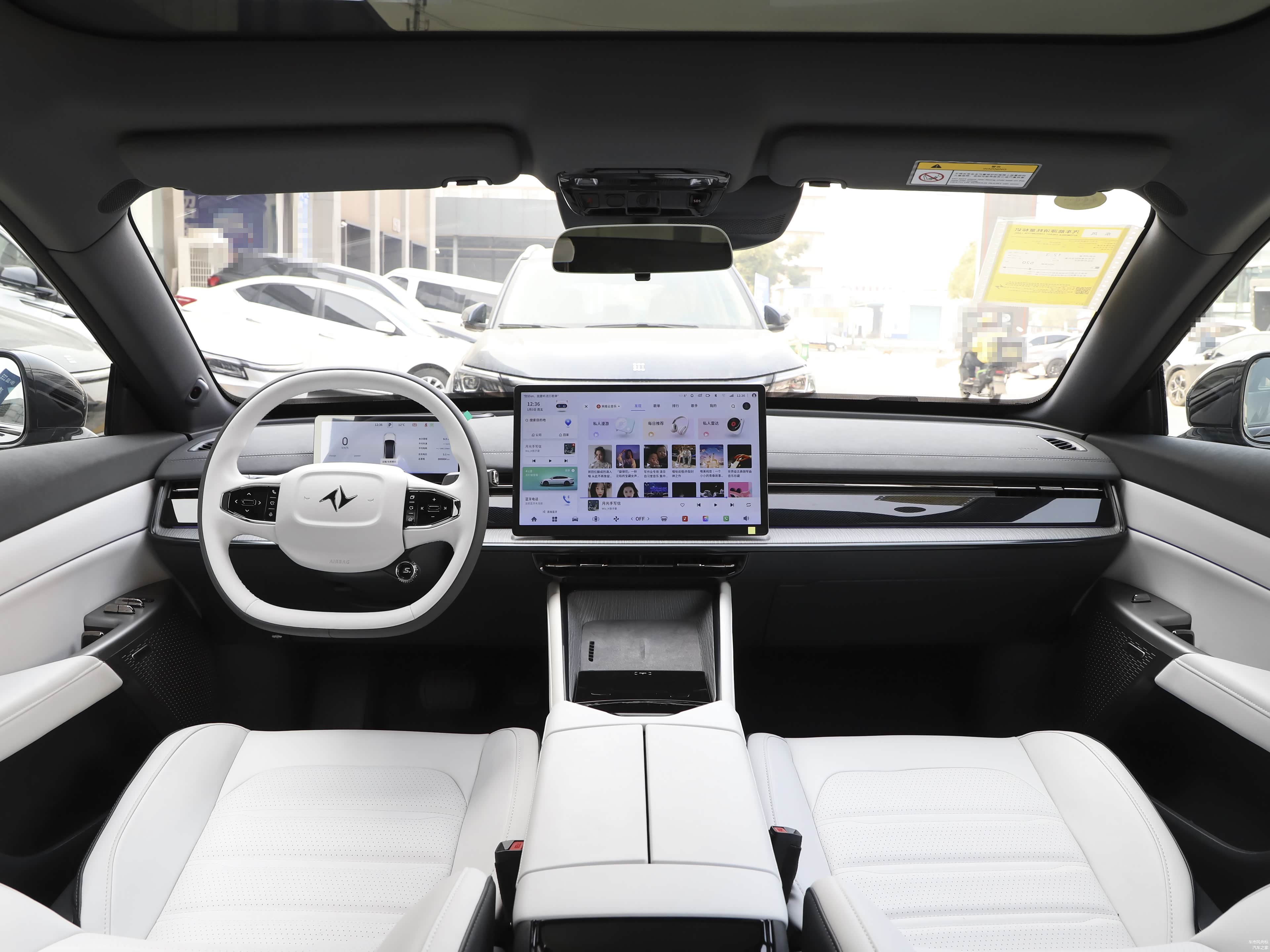 车内简化按键,配8.8英寸液晶仪表和15.6英寸中控屏,车机菜单和操作逻辑简单清晰,容易上手,分辨率还不错,提供了一些快捷功能按键,空调等设置可以触屏操作,内置8155芯片,反应速度还不错,拖拽,放大画面不卡顿,车机的第三方应用偏少,界面较为单一,预计后期OTA会解决这个问题。支持语音识别控制,响应速度和识别准确率都还挺高,连续指令也能识别,整体表现还不错,有意思的是方向盘上单独提供了一个S+按键,也就是所谓的“战斗模式”,打开之后,整套动力的响应更快,中控屏上也会呈现出更运动的赛道画面和相应的油门开度、电机扭矩、电池温度等信息,偶尔玩玩挺有意思。