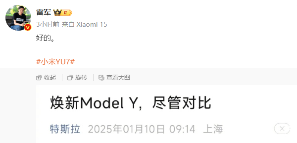 值得关注的是,Model Y焕新,官方表示“尽管对比”,而小米汽车第一时间也发布了“好的”回应,搞流量还得是雷总啊,而小米汽车YU7也将与Model Y正面竞争,你更看好谁呢?