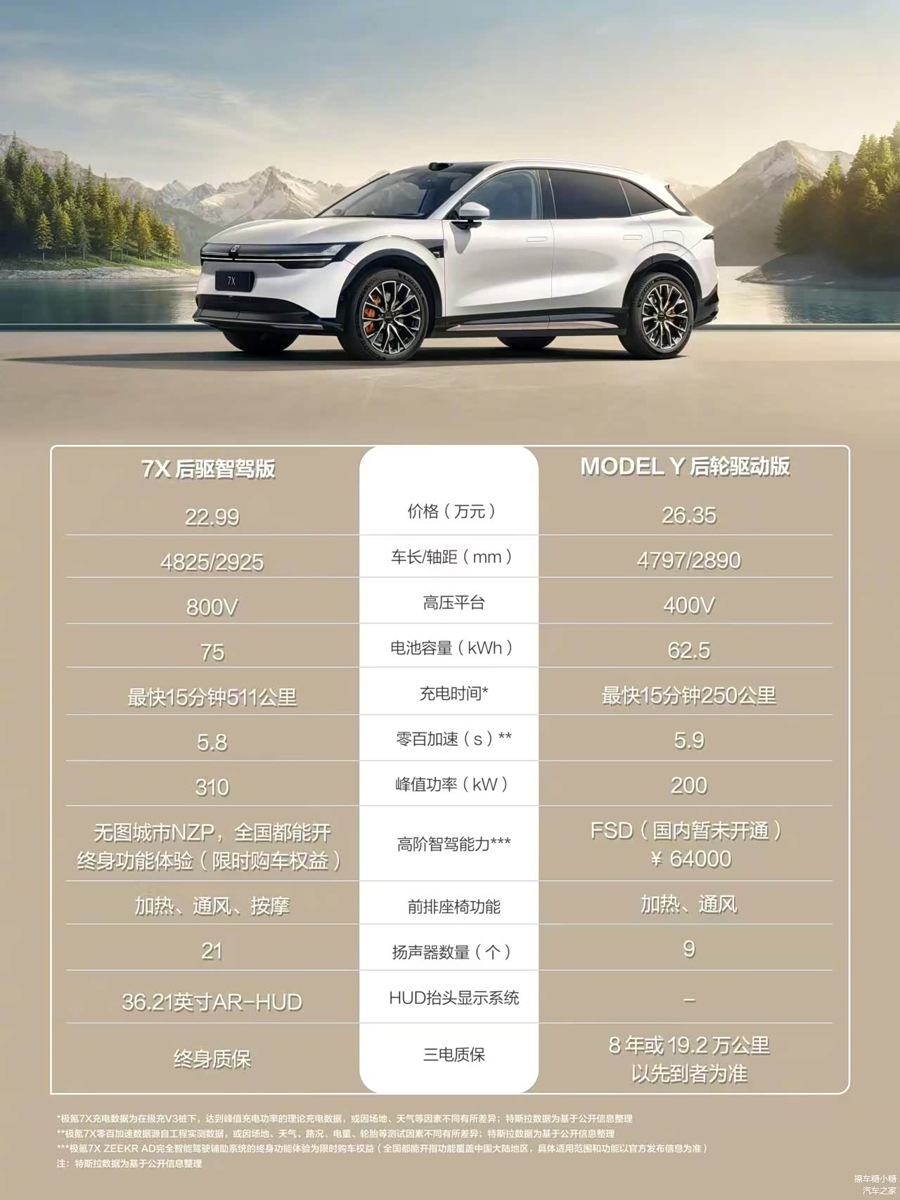 极氪7X:首先价格差了好多,毕竟22.99万起代表了背后吉利能让更多消费者所能够到的实力;然后车长相差无几的情况下,轴距空间表现更好;接着是焕新Y的补能效率会相差一半,这会是被诟病的点;最后还有车辆质保、高压平台架构等方面都是7X的底气所在。