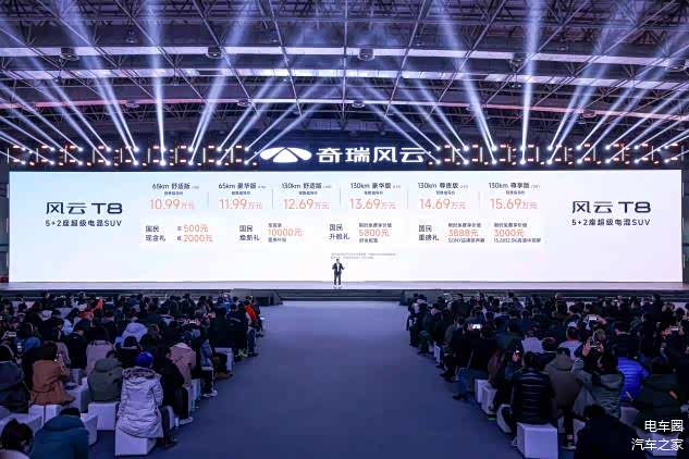 2025年1月11日,奇瑞风云T8在安徽芜湖正式开启预售,本次共推出6款车型,分别为65km舒适版,预售价10.99万元;65km豪华版,预售价11.99万元;130km舒适版,预售价12.69万元;130km豪华版,预售价13.69万元;130km尊贵版,预售价14.69万元;130km尊享版,预售价15.69万元。