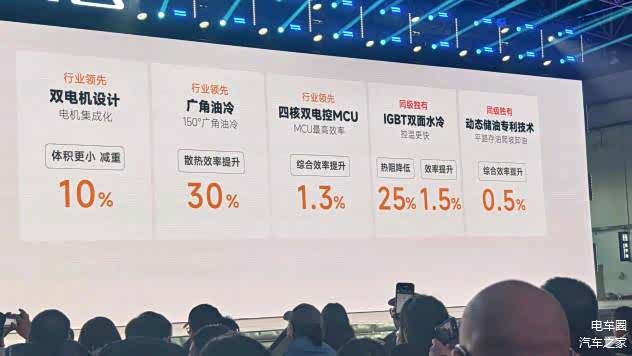 通过集成化设计,进一步为电机减重,还采用了150°广角油冷技术、四核双电控MCU、IGBT双面水冷、动态储油等专利技术,全面压榨电驰效率。