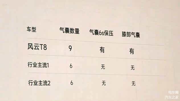 气囊数量、气囊6S保压、膝部气囊,风云T8和同级其它车型也有很大的区别。