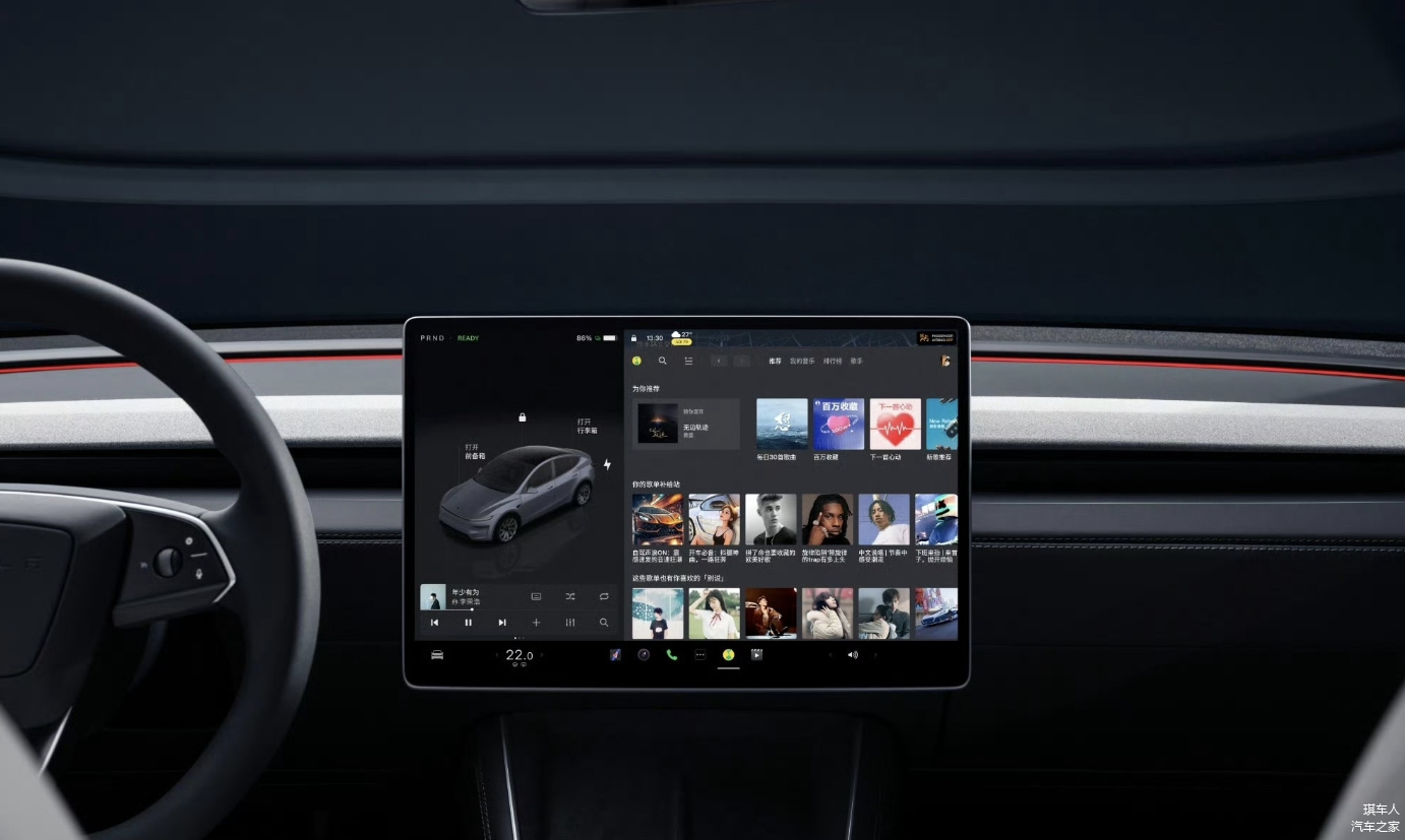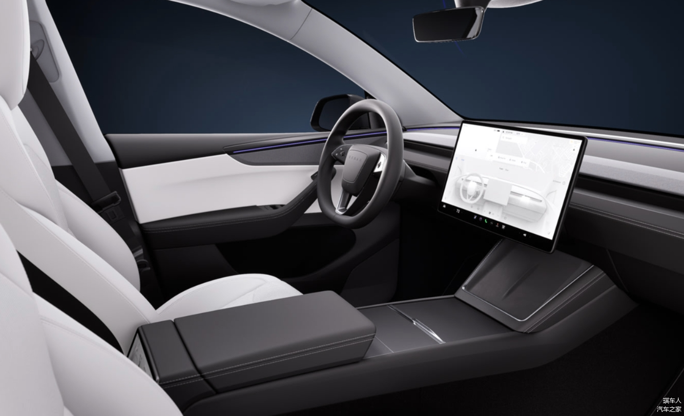 座舱方面倒和Model 3没什么出入,取消了换挡拨杆,变成了屏幕式换挡。加入了前排座椅通风、环绕式氛围灯带,同时也在后排出风口处添置了一块8英寸的屏幕。但值得一提的是,针对座舱内部的舒适性,焕新版Model Y特地进行了多方位加强。