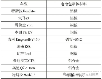 在电池包箱体所用的金属材料中,钢板材料的制造工艺简单、成本低,具有较好的导热性、抗冲击性和热管理能力,为箱体的常用材料,但其主要缺点是质量较大。随着汽车轻量化设计理念的深入,铝合金因密度小、刚强度大和压铸性能好等优点,逐渐成为实现汽车轻量化的主要材料,目前已经生产出铸铝电池箱、铝板材电池箱和铝型材电池箱等产品。其中,铝制电池包箱体的承载结构主要分为底板式和框架式。大众公司研究发现,框架承载式结构的箱体能满足不同结构的强度要求,更易实现轻量化。此外,金属和塑料的结合也是实现电池包箱体轻量化的主要方式,如比亚迪-秦(Pro EV500)电池包的上、下壳体分别采用片状模塑料复合材料(Sheet Molding Com⁃pound,SMC)和高强铝。考虑到成本、加工等因素,国内入门级和经济型电动汽车的电池包外壳多采用钢制箱体,部分新能源汽车电池包采用金属箱体材料,如表所示。