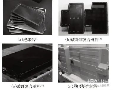 电池包箱体使用的复合材料以碳纤维复合材料、玻璃纤维增强复合材料和SMC复合材料等轻量化材料为主,不同材料制成的电池包箱体结构如图所示,国内外学者对复合材料箱体也有针对性的研究。德国ICT化工技术研究所研制出了一种以聚氨酯为基体的热固性塑料电池包箱体,该箱体质量35 kg,可承载340 kg的电池组,比同等规格钢材质量减轻35%以上。邵明顶等利用连续玻璃纤维编织布作为基材,环氧乙烯基树脂作为基体的玻璃纤维增强复合材料通过预浸料模压成型工艺制作电池箱体,也实现了轻量化效果。