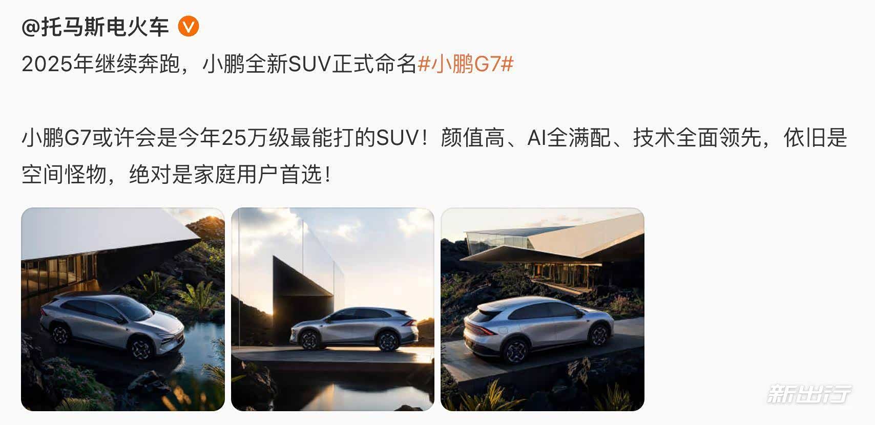 昨日( 2025 年 1 月 9 日),小鹏汽车发布了三张小鹏 G7 官图;今日( 2025 年 1 月 10 日),特斯拉 Model Y 焕新版直接发布价格。