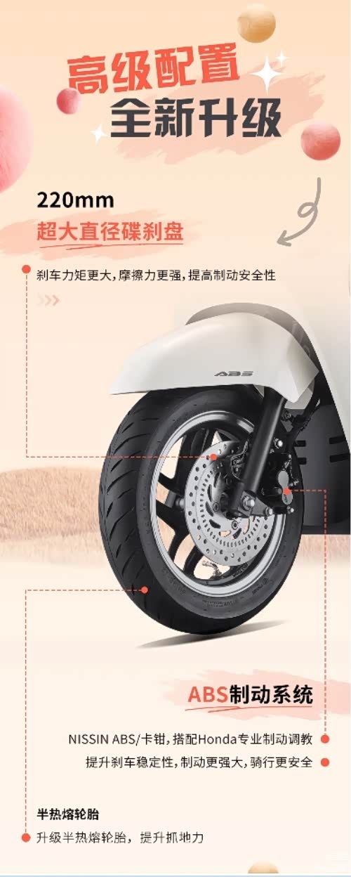 安全方面,2025款 新大洲本田NS125LA前轮采用了220mm超大直径碟刹盘配合日清制动卡钳,此次新增ABS防抱死系统,安全性能大幅度提升。除此之外,之前老款轮胎硬滑的问题也进行了升级,换装半热熔轮胎,抓地力表现有所提升。