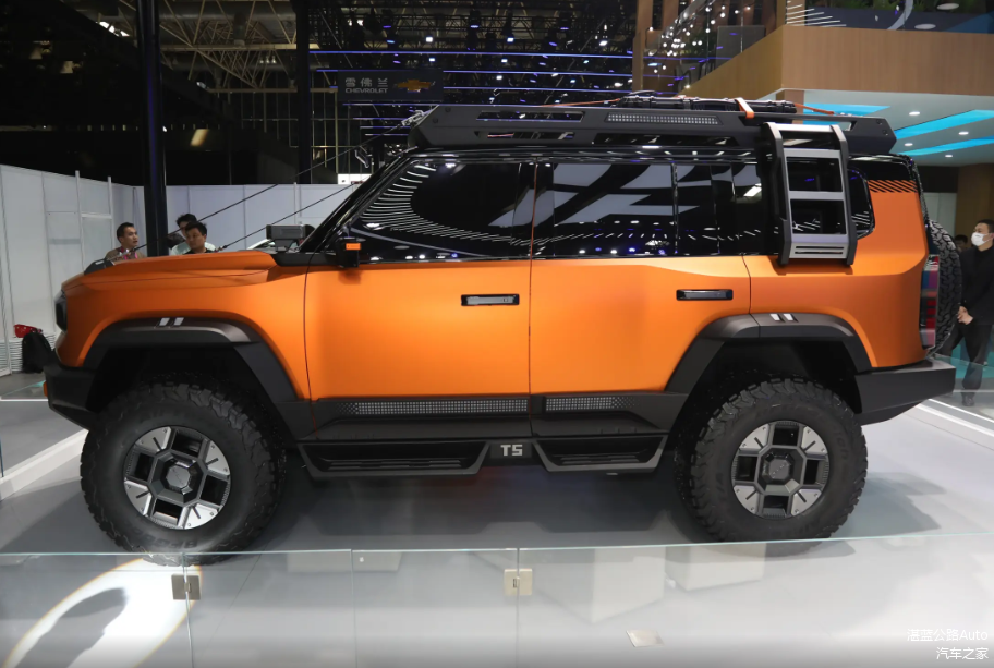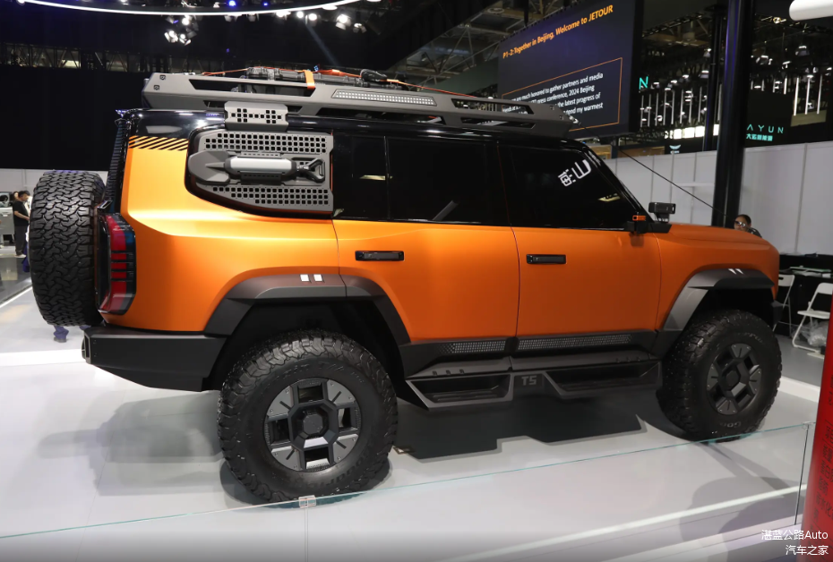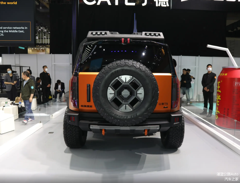 从此前实拍的外观来看,捷途山海T5的基本造型还是我们熟悉的造型,这一设计和捷途山海T2也是很相似的,方正的造型并且用了硕大的轮胎,而不管是轮眉、前后保险杠还是说车顶平台的设计,都是很硬派的,尾门除了是侧开式处理以外,尾部还有硕大的外挂备胎,当然原车标配的未必有硬派十足的AT轮胎,预计是高配或者说是需要选配。