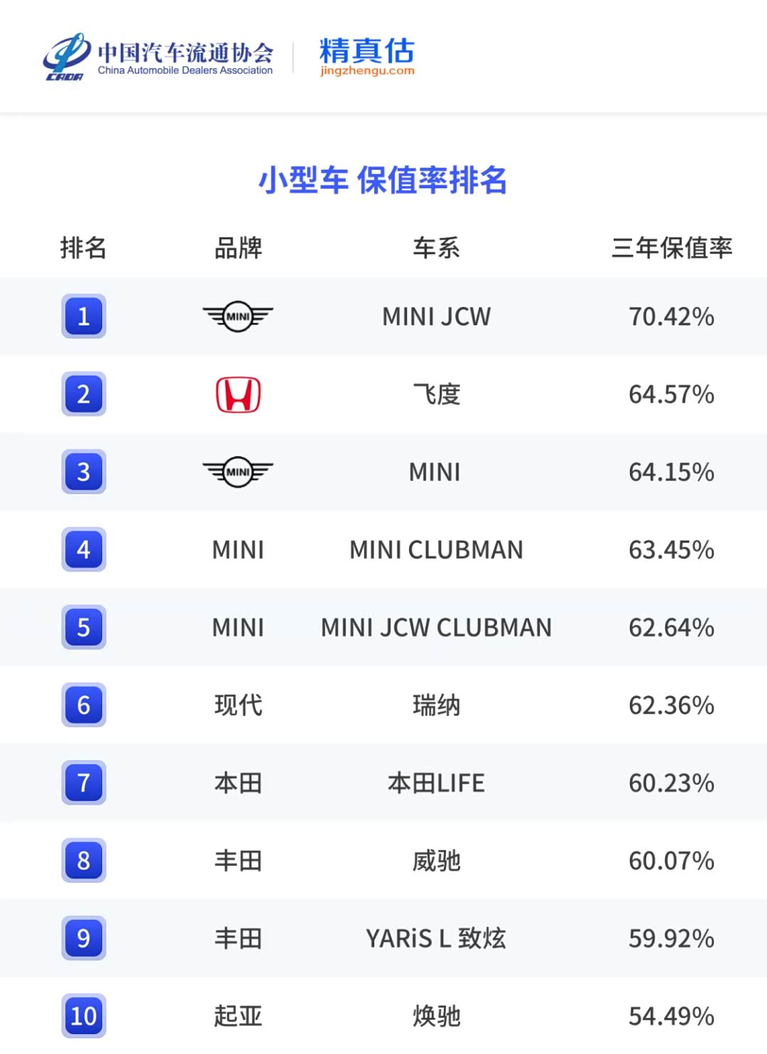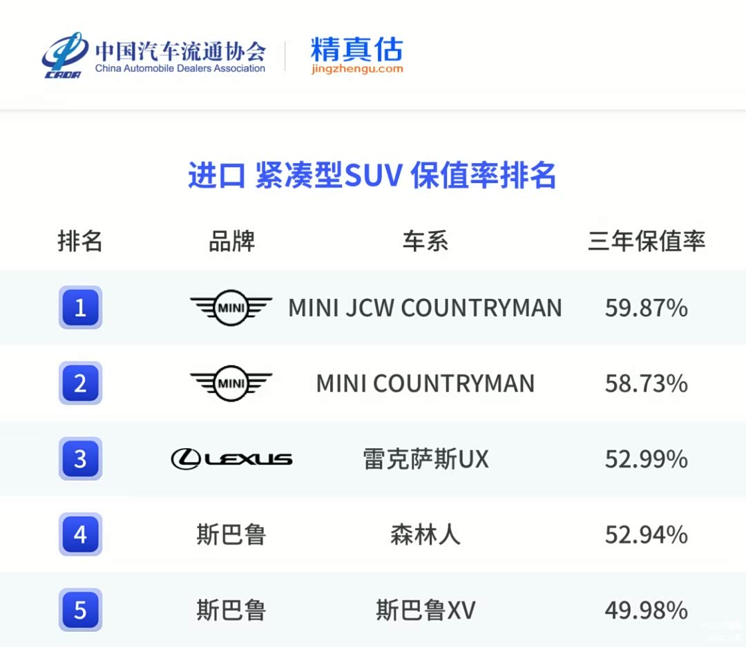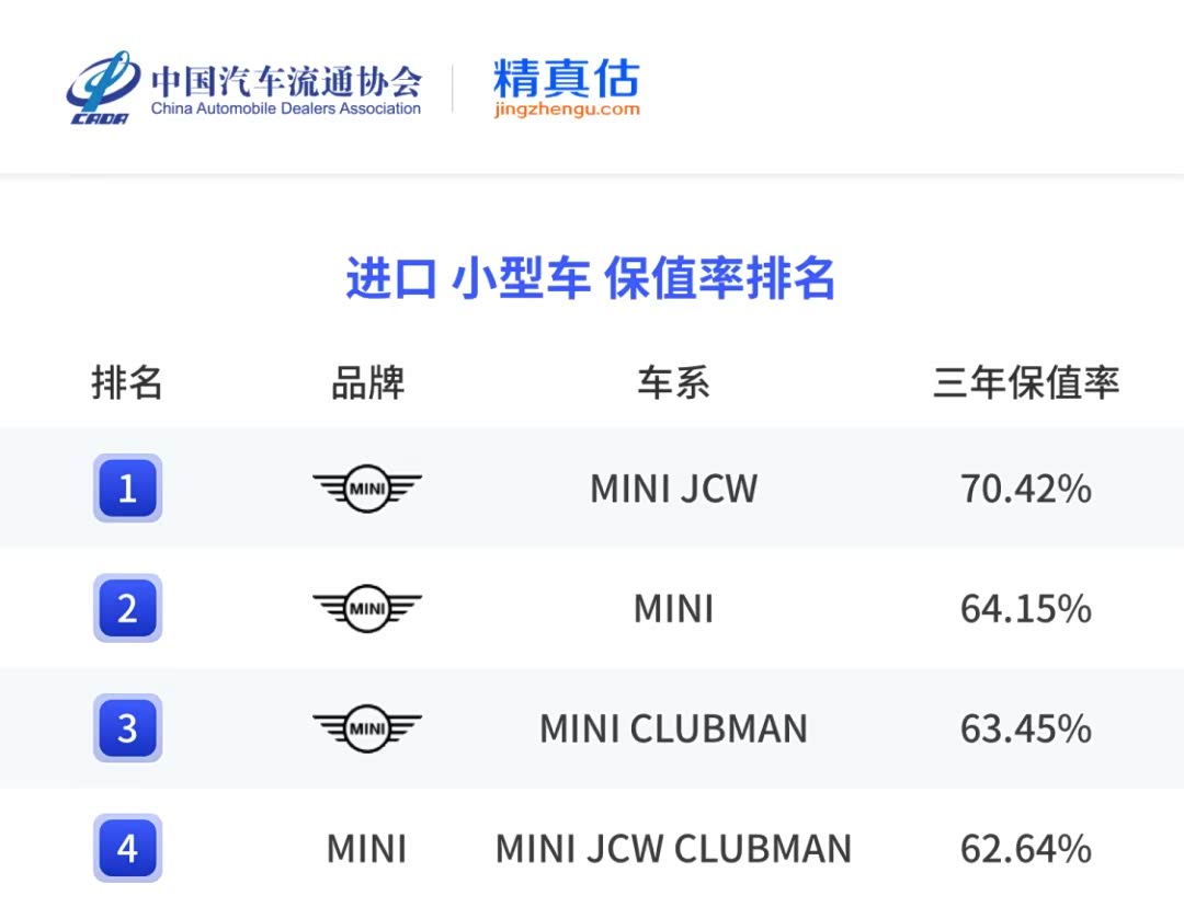 官方认证保值率王者原来是他!MINI霸榜中国汽车流通协会近日发布的《2024年度中国汽车保值率报告》榜单,多款MINI车系在中小型车、进口小型车、紧凑型SUV以及进口紧凑型SUV 4个保值率排名中名列榜首,其中MINI JCW车系的3年保值率甚至高达70.42%,远超行业均值,堪称小车保值率王者。
