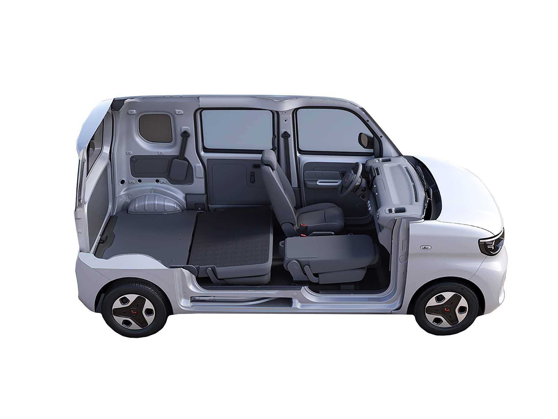车辆的内部装饰呈现出简约的设计风格,因为官方已经将其定位为多功能车型,配备了织物座椅和收音机、USB充电口、手动空调和旋钮式换挡系统。此外,仪表台的两侧还额外设置了两个杯架,这与MINI EV马卡龙有着相似的功能。