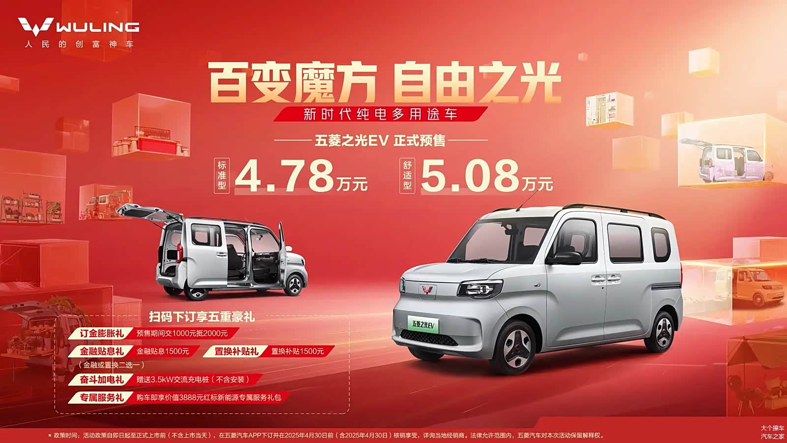 在1月17号这一天,五菱之光EV正式开始了预售活动。这款新车推出了两种配置选项,预售价格范围是4.78-5.08万元。它被定位为“纯电多用途车”,并具备外部放电和座椅的纯平放倒功能。除了用于商业运输,它还非常适合户外露营和移动销售等多种场合。配备了30kW后置电机的CLTC,其纯电动续航距离可达201km。