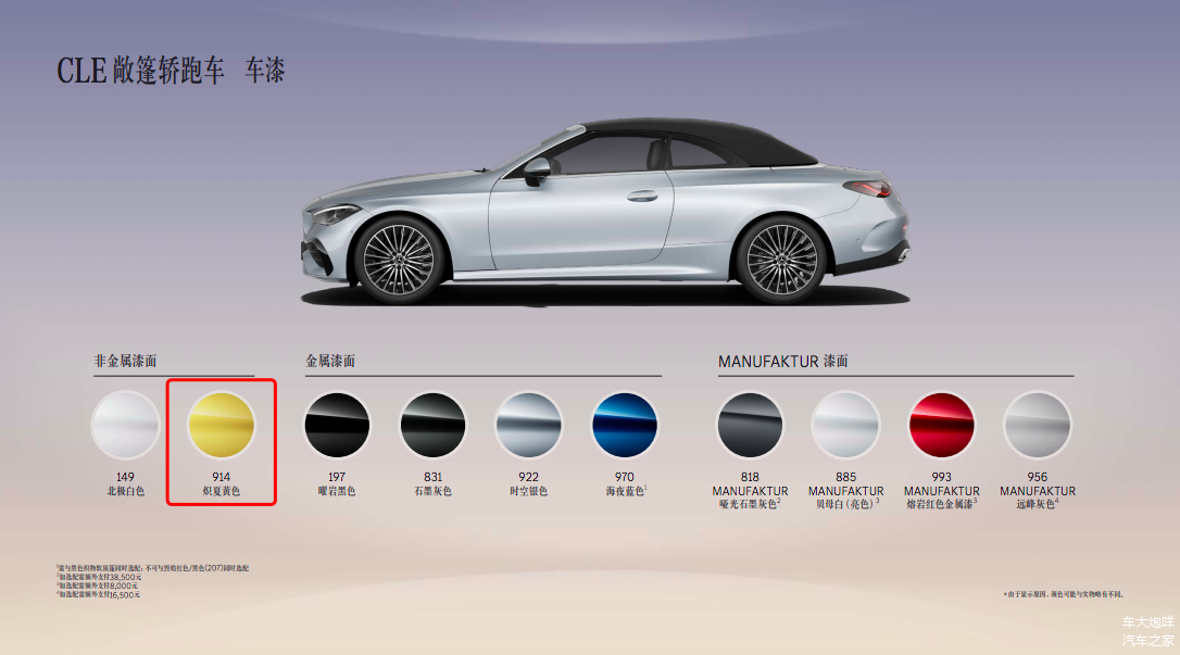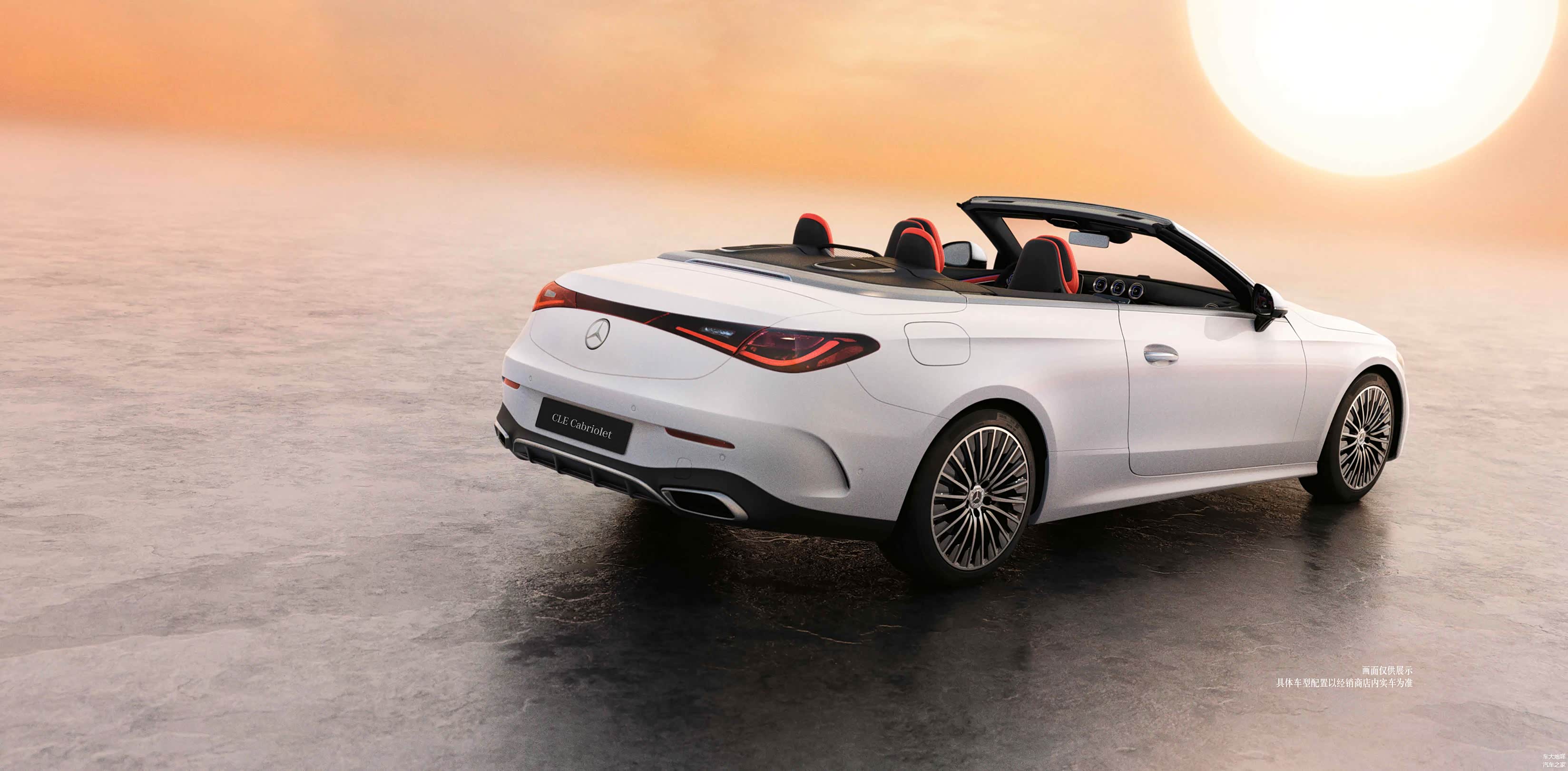 新款奔驰CLE敞篷轿跑车共计可选3种软顶篷,默认搭载黑色织物软顶篷,红色织物软顶篷以及灰色织物软顶篷以付费选装形式供应,价格为2000元。此外,新款奔驰CLE敞篷轿跑车的可选车漆数量提升至10种,新增炽夏黄色(非金属漆面)。车身尺寸方面,新款奔驰CLE敞篷轿跑车的长宽高分别为4850/1861/1425毫米,轴距为2865毫米。