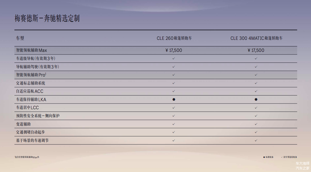 新款奔驰CLE敞篷轿跑车全面升级驾驶辅助系统,标配自适应巡航ACC、车道保持辅助LKA、侧面盲点辅助BSD等功能,并且全系可选装由中国团队主导研发的L2+导航驾驶辅助。此外,新款奔驰CLE敞篷轿跑车还支持付费选装畅心醒神功能,其余功能配置基本没有变化。