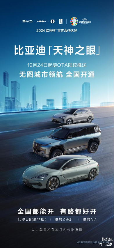 除了2025款汉EV之外,在宣传海报上我们还可以看到:仰望U8豪华版、腾势Z9GT、腾势N7也已开通了无图城市领航(CNOA)功能。