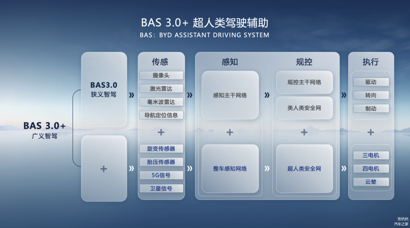 比亚迪智驾的技术特点是强调整车智能智电融合,实现BAS3.0+超人类驾驶辅助。