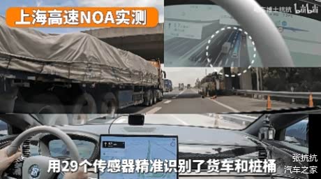 比如下面这个场景,汉EV即将汇入主路时,左侧遇到大货车,前方偶遇桩桶施工车辆,让人很慌。好在汉EV的“天神之眼”DiPilot 100 平台,用29个传感器精准识别了货车与桩桶,减速之后稍加绕行,顺利开了过去!同行的媒体朋友水雾同学在旁边连连喊:牛!太牛了!