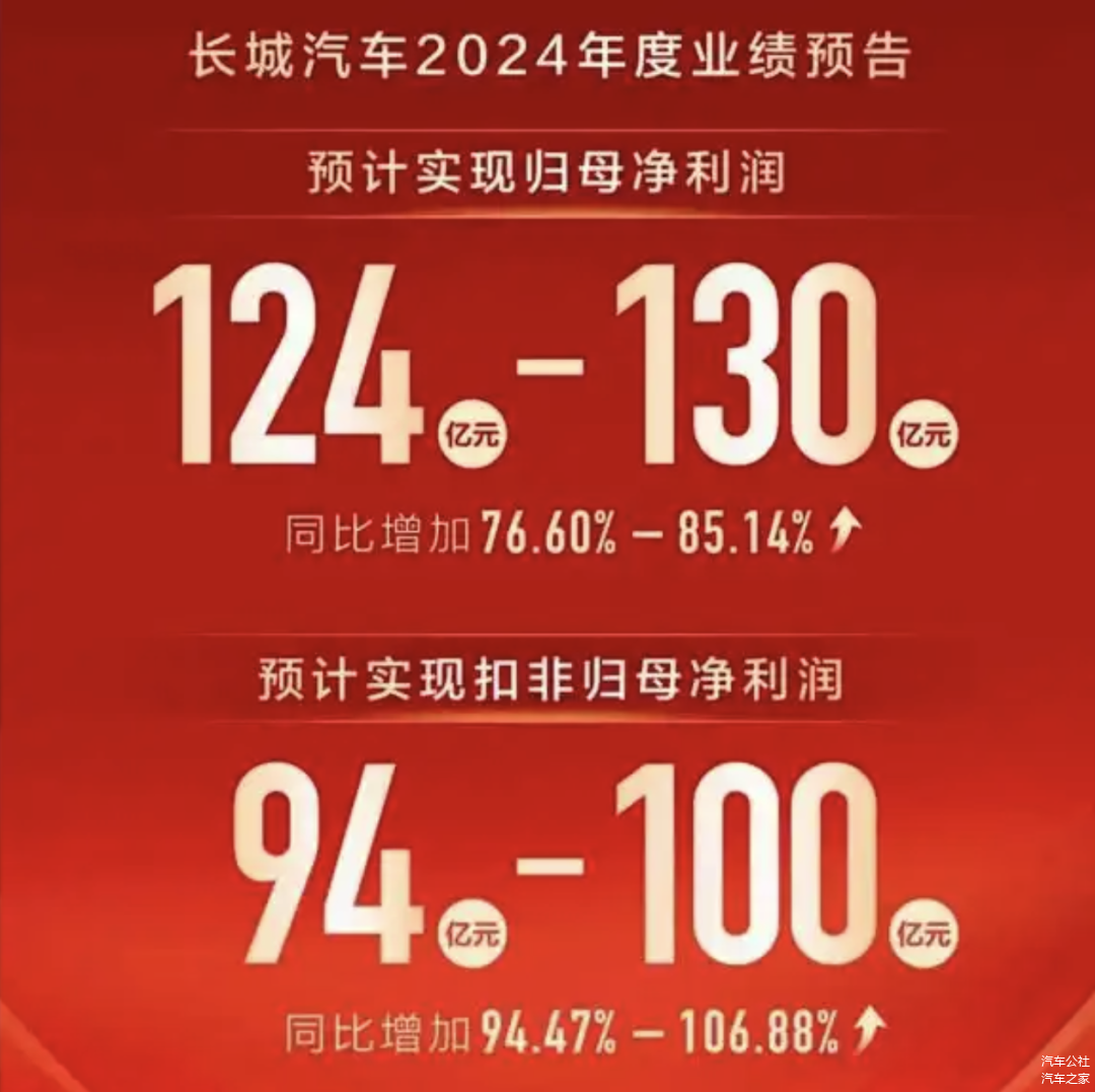 从2024年第一天开始,长城走下价格战牌桌,走上“稳量求利润”之路。1月14日,长城汽车发布2024年度业绩预告:公司销量123.33万台,同比仅增0.21%,但预计实现净利润124亿元到130亿元之间,同比大幅度增加76.60%到85.14%。
