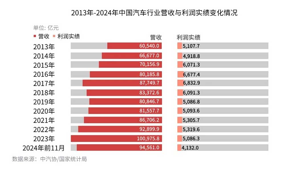 截止2024年11月份,中国汽车行业的利润率为3.3%,同比下降35%,2024年1~11月的汽车行业利润率4.4%,同比下降7.3%,相对于工业企业6.1%的平均水平仍偏低。中国汽车在产销数字上傲视全球,但日渐内卷市场、深度价格战和消费下行多重影响下,利润早已偏离合理水平。