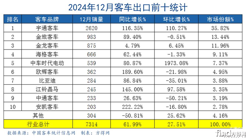 2024年12月,行业重点关注的企业客车出口7314辆,环比增27.51%、同比大涨61.99%!2024年全年客车出口定格在61820辆、累计增幅41.10%!中国客车出口首次突破6万辆大关,创造新的历史纪录!