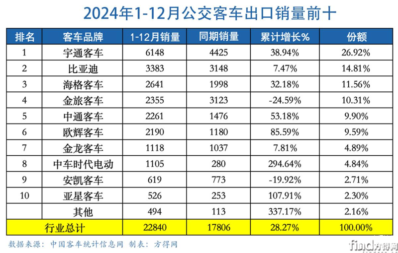 2024年公交客车出口累计22840辆、同比增长28.27%。