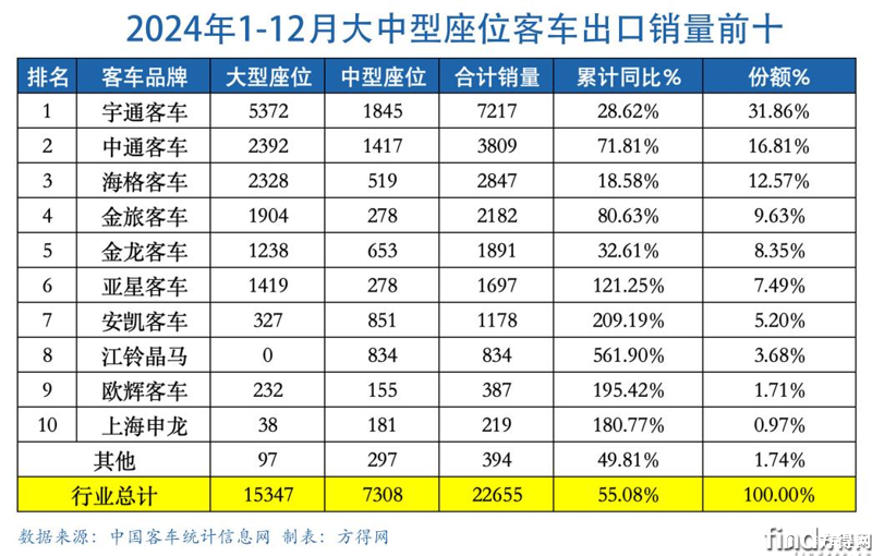 在客车行业最具“含金量”的大中型座位客车领域,2024年行业合计出口22655辆,同比大涨55.08%。