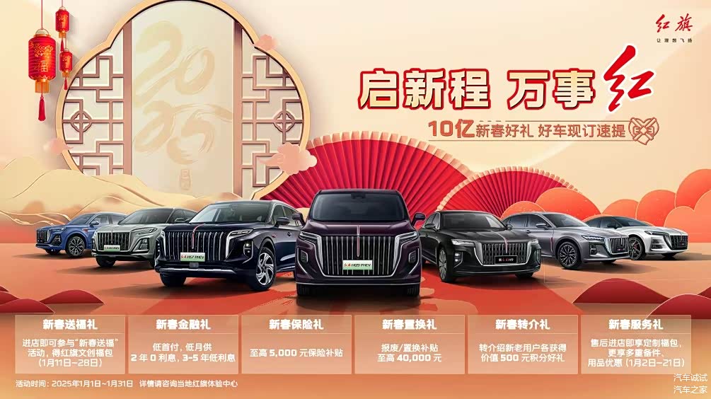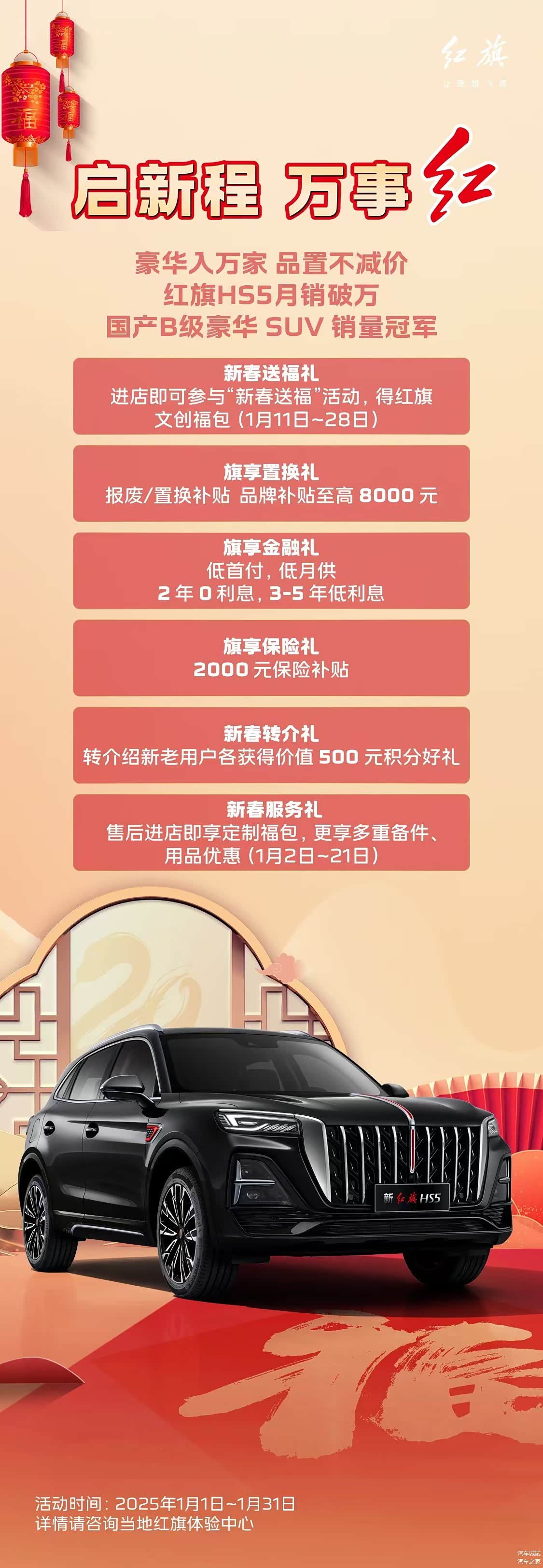 值此新春佳节到来之际,红旗品牌也为春节期间购车用户推出了启新程万事红的新春购车权益,以2025款HS5为例,在保持目前车价优惠的基础上,红旗还为HS5用户带来了低首付、低月供2年0利息,3-5年低利息;报废/置换补贴至高8000元;2000元保险补贴;转介绍新老用户各获得500元积分好礼等权益。更有进店参与“新春送福”活动,得红旗文创福包(1月11日-28日);售后进店即享定制福包,更享多重备件用品优惠(1月2日-21日)详情请咨询当地红旗体验中心。