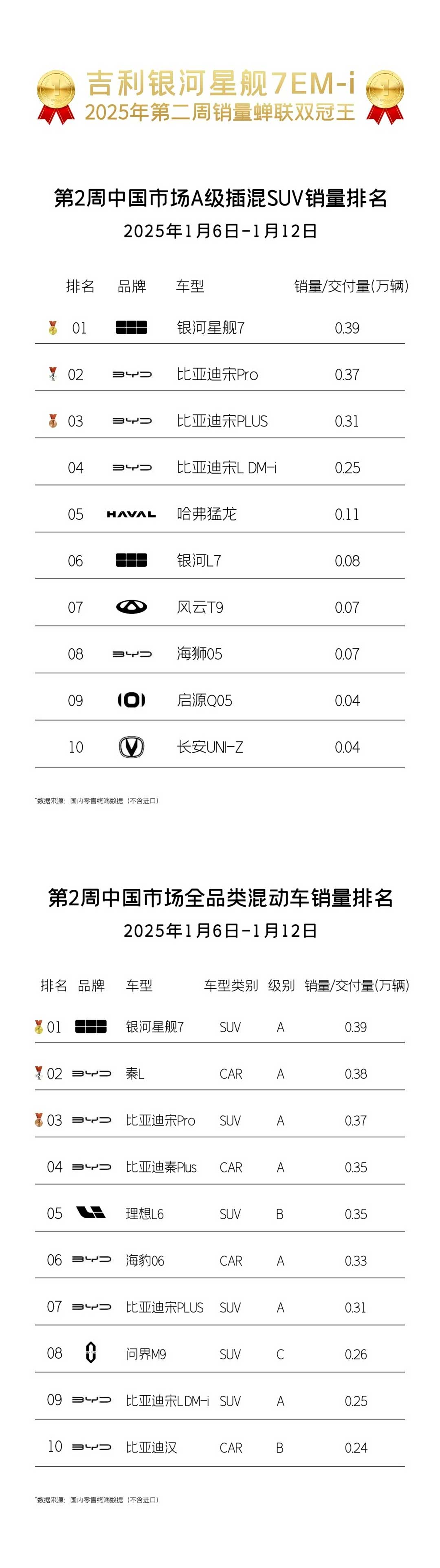 而在刚刚过去的2025第二周车企销量普遍复苏情况下,吉利汽车周销量2.67万辆,环比增加99.25%,接近翻番。至此,吉利已经连续两周蝉联冠军,真正实现了2025年的开门红。