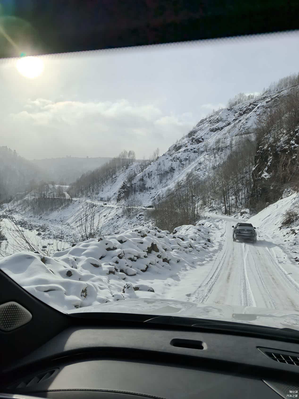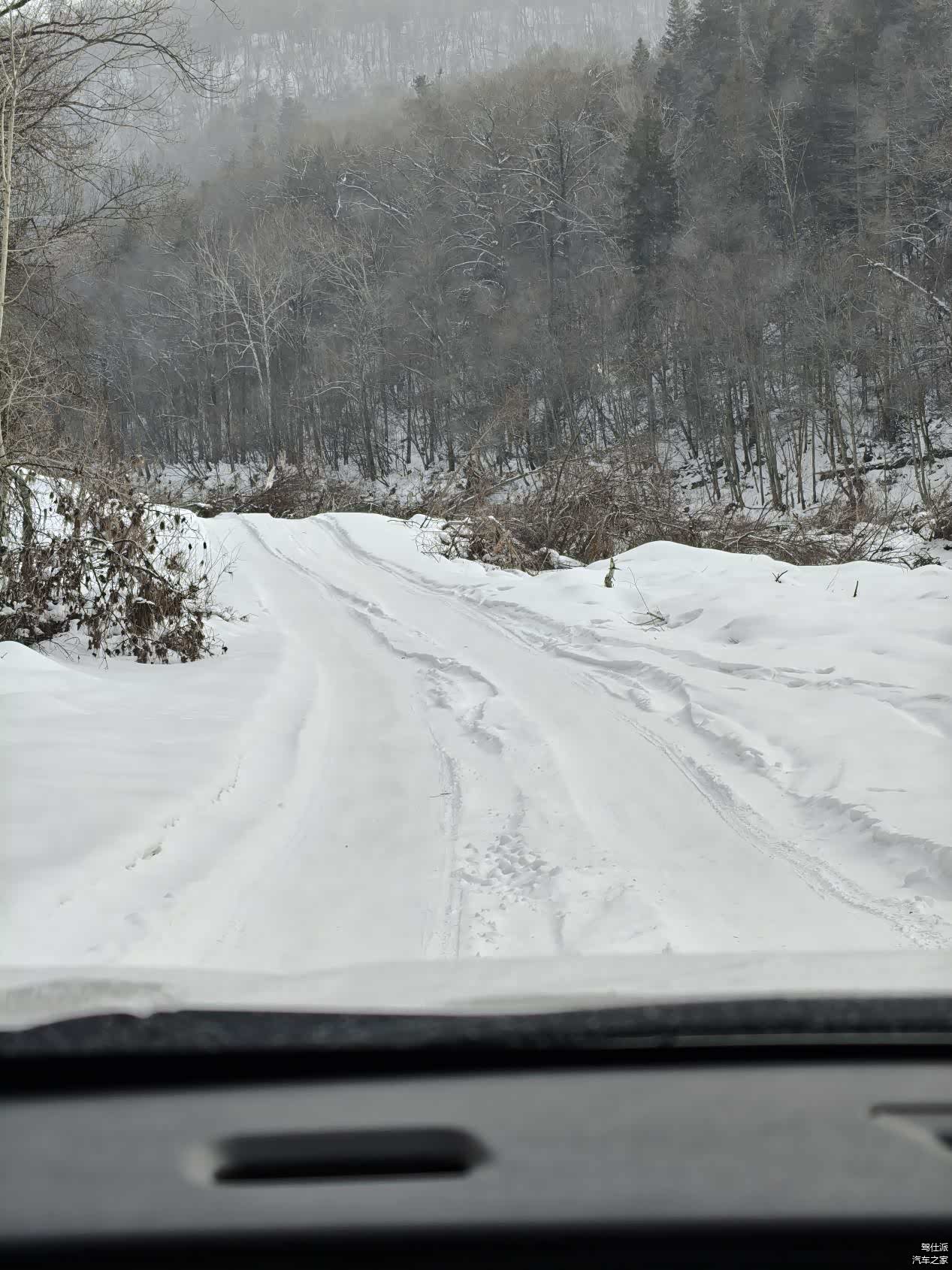 试驾车是限时一口价33.59万元(实际售价)的铂金型,用上了265宽度的佳通雪地胎,全程四驱AWD模式从酒店出发,开往山谷的露营地。