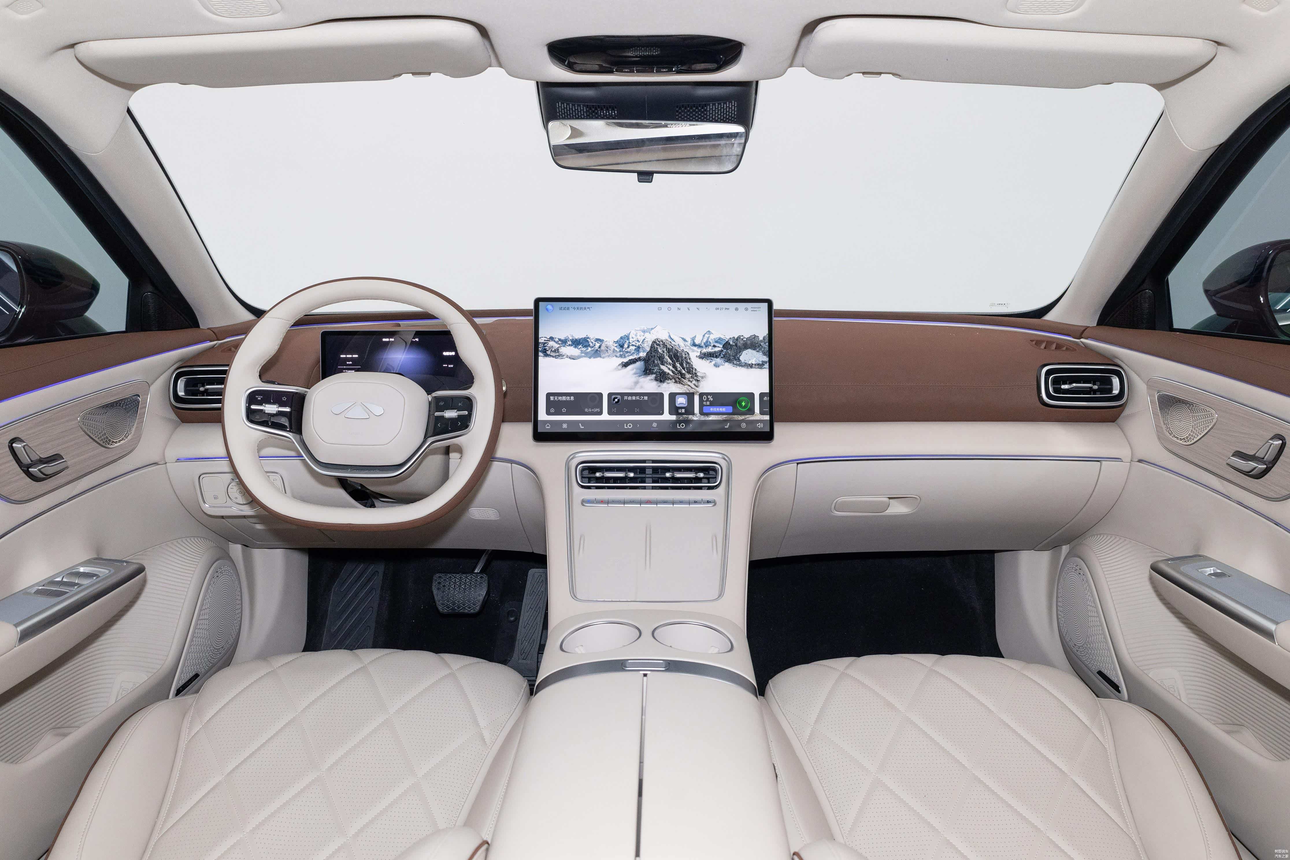 内饰方面, 风云A9(图片 | 参数 | 询价)采用了双色风格,配备15.6英寸悬浮式中控屏和液晶仪表盘,几乎没有物理按键。车内还提供了四座车型,配备四门+后风挡全车隐私玻璃、独立行政沙发座椅、10点按摩、电动调节腿托、车载冰箱等豪华配置。