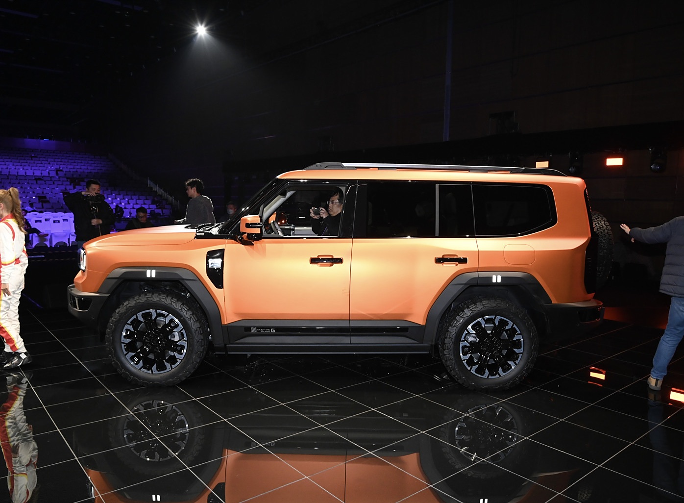 再来看新车的车身侧面部分,车身造型整体方正而硬朗,并且平直的车顶结合低趴的行李架设计,整体的越野氛围很浓郁,而车床部分为贯穿式的造型,因为熏黑的A柱设计还形成了悬浮式车顶的造型,车门部分造型平直,结合轮眉部分整体外扩的造型,让新车整体的肌肉感更加浓郁,并且轮眉部分的宽厚黑色饰板,以及车裙底部的宽厚黑色饰板与脚踏板设计,让新车整体有着撞色的年轻视觉效果,车身尺寸方面,纵横G700的车身长宽高分别为5403/2050/1936mm,轴距为3100mm,称得上是一台标准的全尺寸SUV身材。