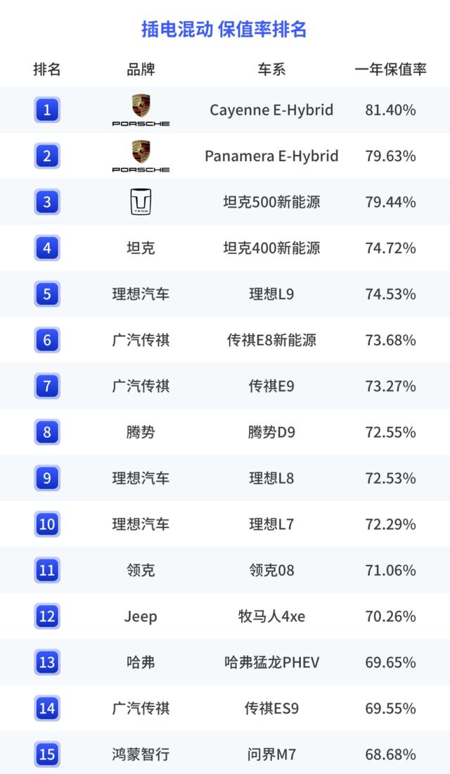 根据以上榜单可以看到,位列第一、第二名的均是保时捷旗下的产品,分别是保时捷卡宴新能源、保时捷帕拉梅拉新能源,一年保值率依次是81.40%、79.63%。需要注意的是,保时捷的车保值率高不代表卖车时亏的钱少,因为买保时捷的车是需要加价选装的,随便一台车选装价格都可能超10万元。
