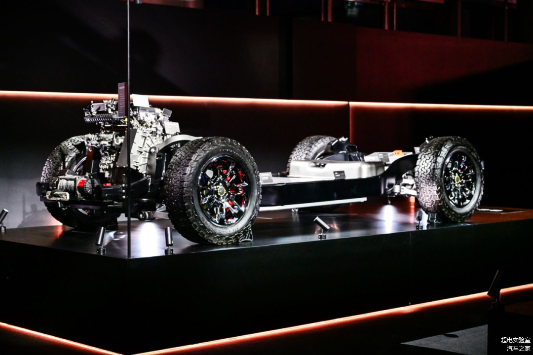 其搭载的是鲲鹏超能混动CDM-O系统,2.0TD发动机以及三电机架构的电四驱,配备非承载式车身+三把锁的架构。