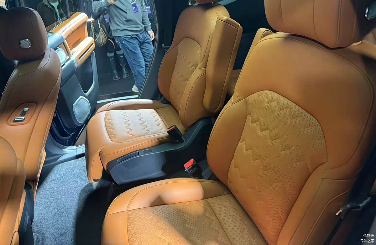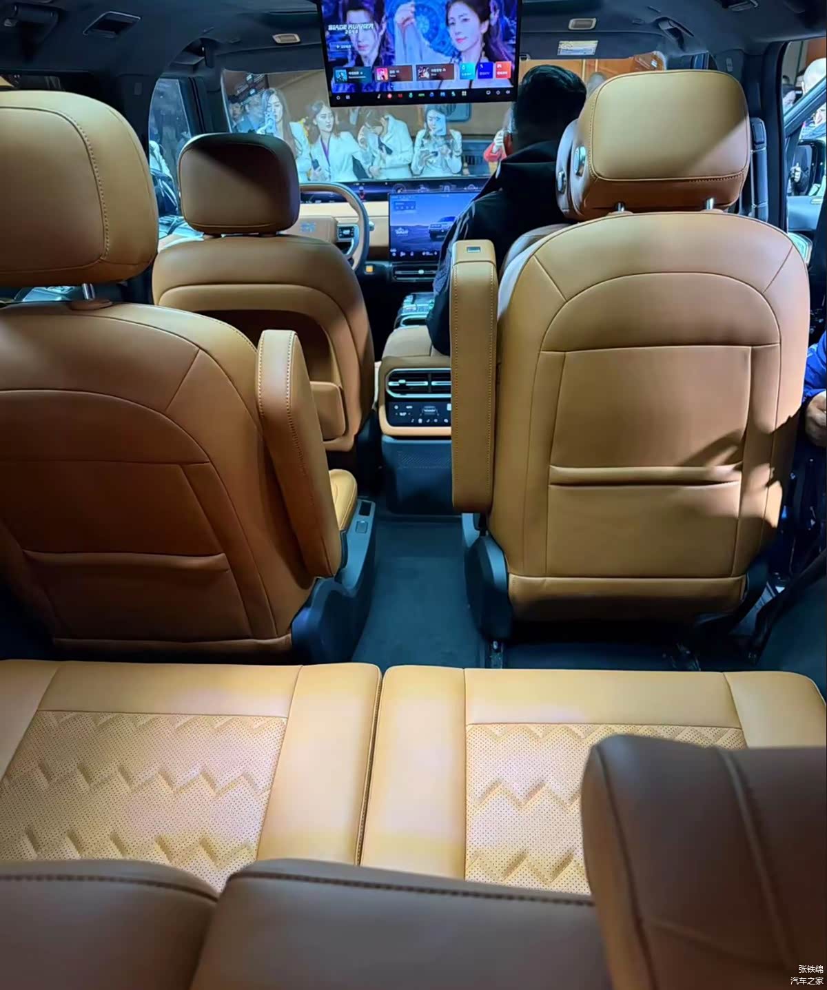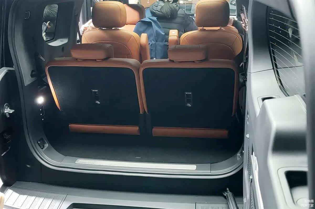新车使用了2+2+2的6座布局,第二排座椅带有内侧的折叠扶手,还带有电动腿托,第二排地板很平整,车顶还提供了后排电视大屏。进入第三排的二排座椅中间过道很宽,第三排座椅使用了两个能够单独折叠的座椅,有着不错的拓展性。