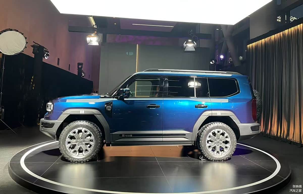 车身侧面也是很方正硬朗的硬派设计,车顶带有行李架,A柱使用了隐藏式的涂装,D柱造型很宽厚。前后翼子板上部是隆起的筋线造型,看上去很有力量感,车门把手使用了传统的外拉式。黑色的外廓式轮眉造型很立体,上部还带有示廓灯。
