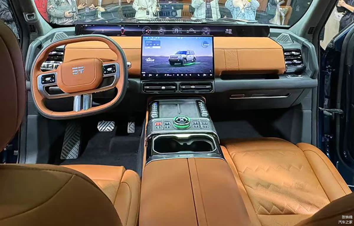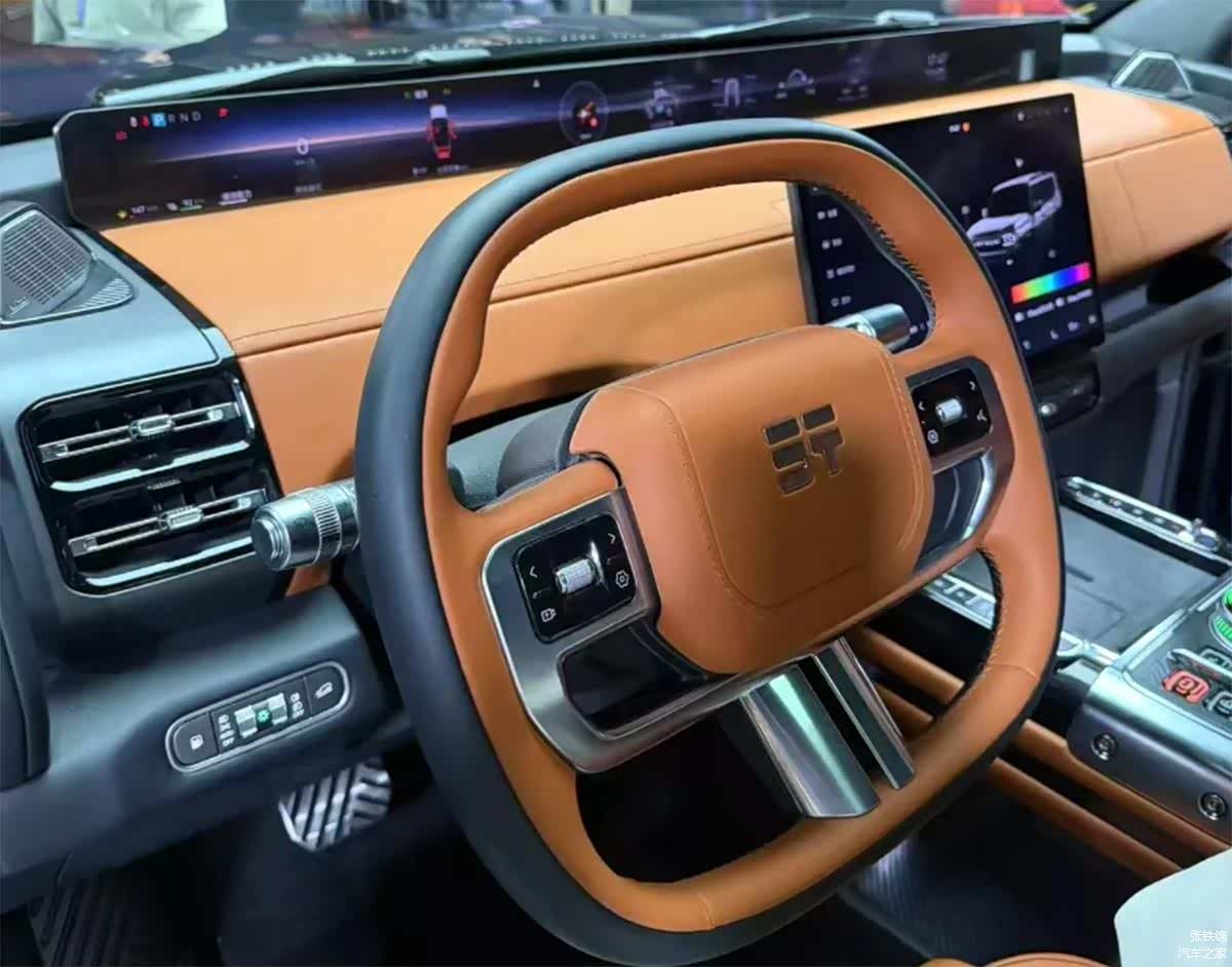新车的内饰设计很抢眼,有着不错的豪华感。中控台整体造型很有层次感,使用了横贯式的远端屏,同时还提供了悬浮式的中控大屏。中控面板使用了大面积的皮质装饰,两端带有上车把手设计。三幅式的方向盘造型很个性,上下平齐,使用了双色皮质包裹,还带有镀铬装饰。