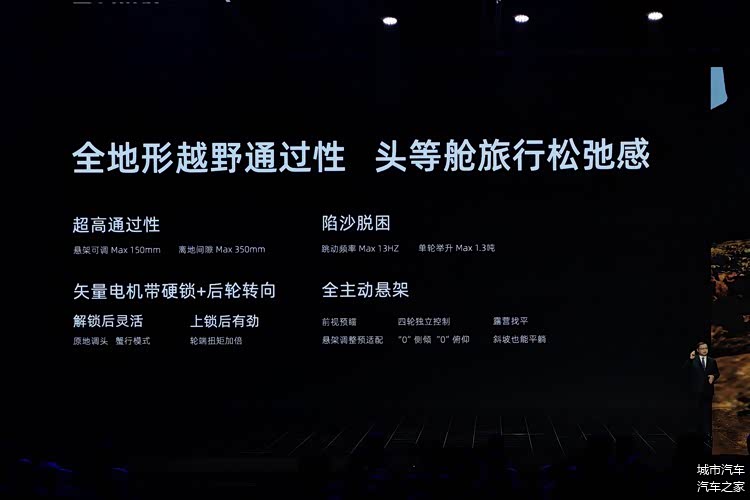 这套系统四个车轮都采用双腔空簧+双阀CDC支撑底盘,悬架支持最大150mm的行程可调,全地形越野模式下最小离地间隙能达到350mm,最大升举力1.3t。
