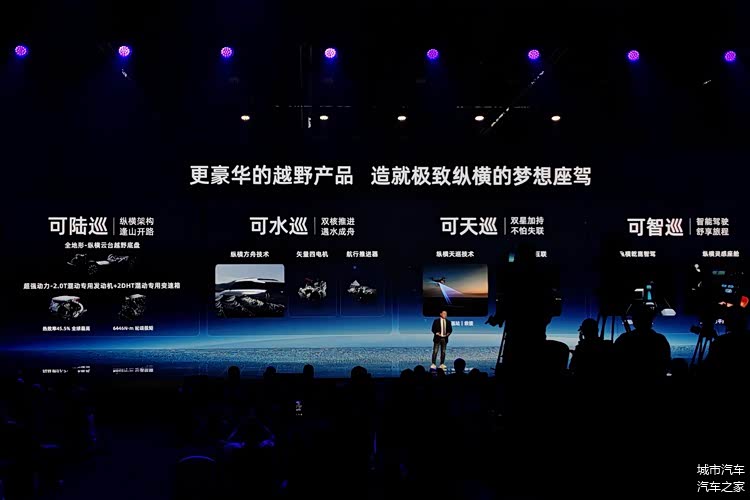 除了上面的CDM-O,捷途纵横还发布了更高阶的两栖黄金增程CEM-O,包括大功率增程器、800V 6C双层麒麟电池、矢量四电机、以及两栖航行推进器,并在纵横G900上应用,主要竞争对手是仰望U8。