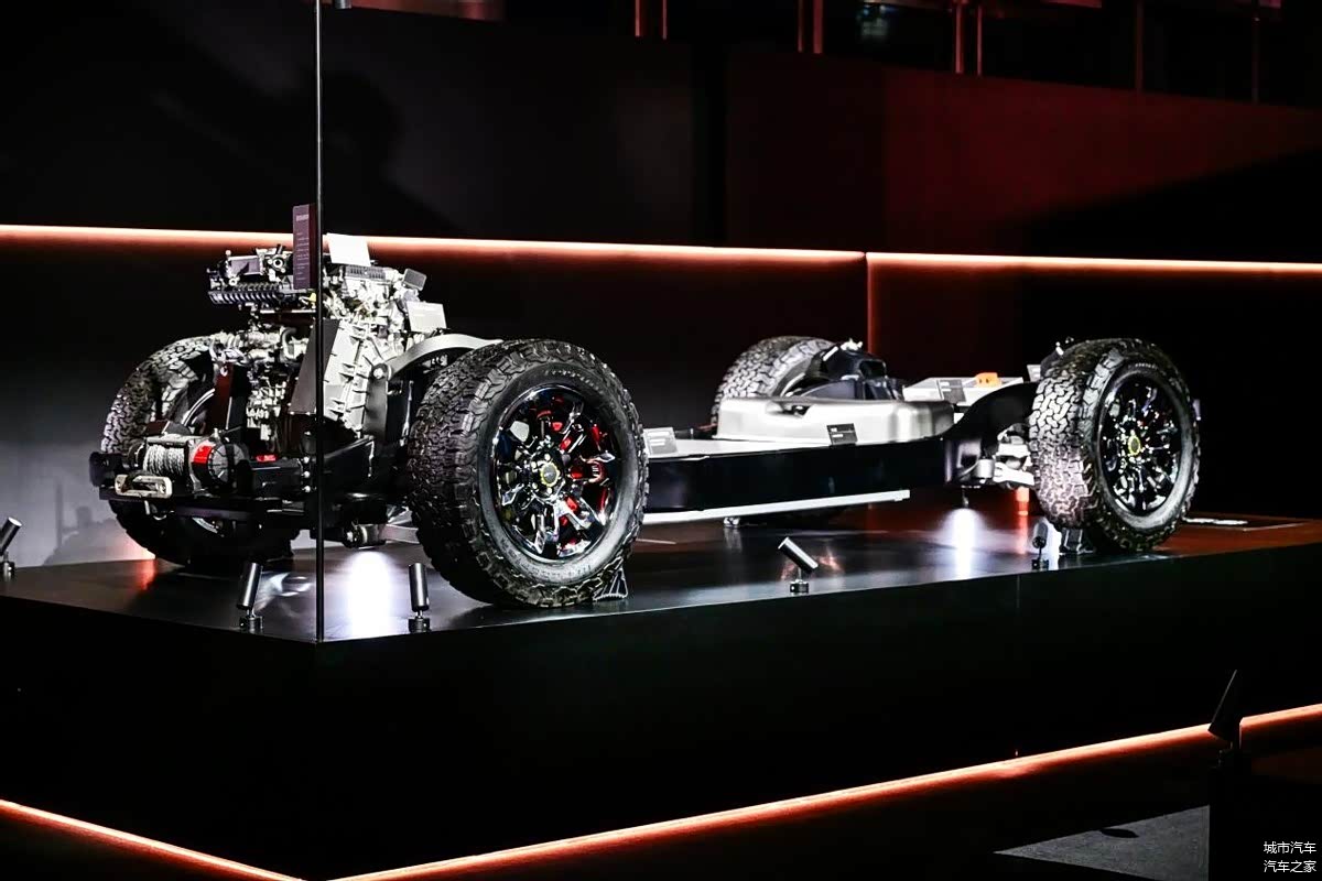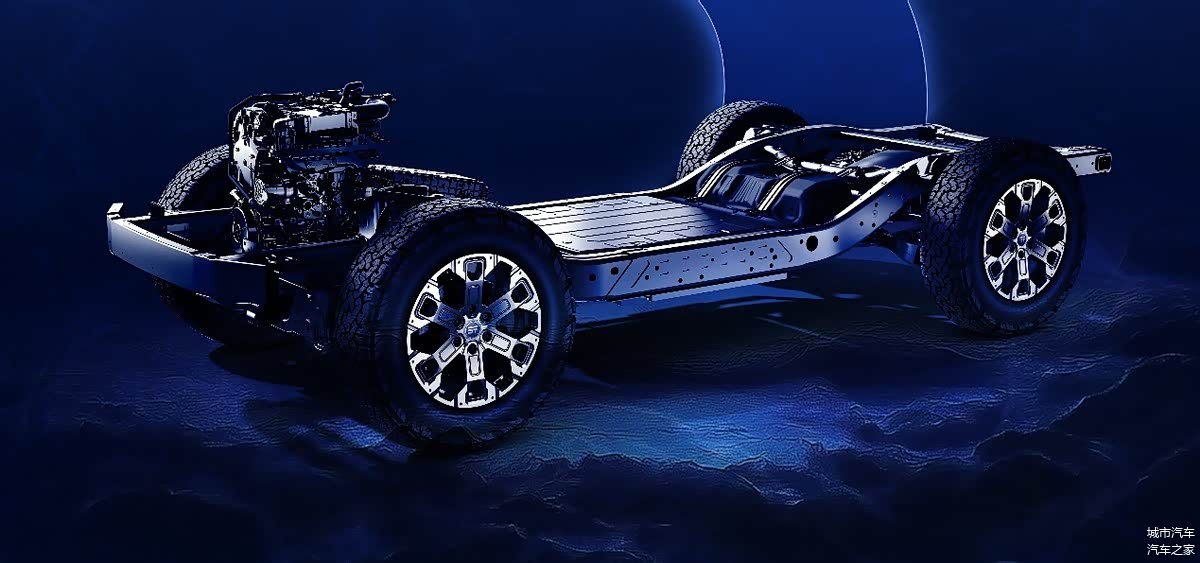 确实,CDM-O和C-DM一样采用的“混动专用发动机+前桥DHT双电机+独立后桥P4电机”的电混思路,不同的是,前者专门为非承载式车身的越野准备,配备纵置布局的混动专用2.0TD发动机和双电机,同时后桥还配备P4电机,并且前后都支持两挡调速。另外,这套系统还使用越野专用双层布局神行电池,达到800V、4C标准。