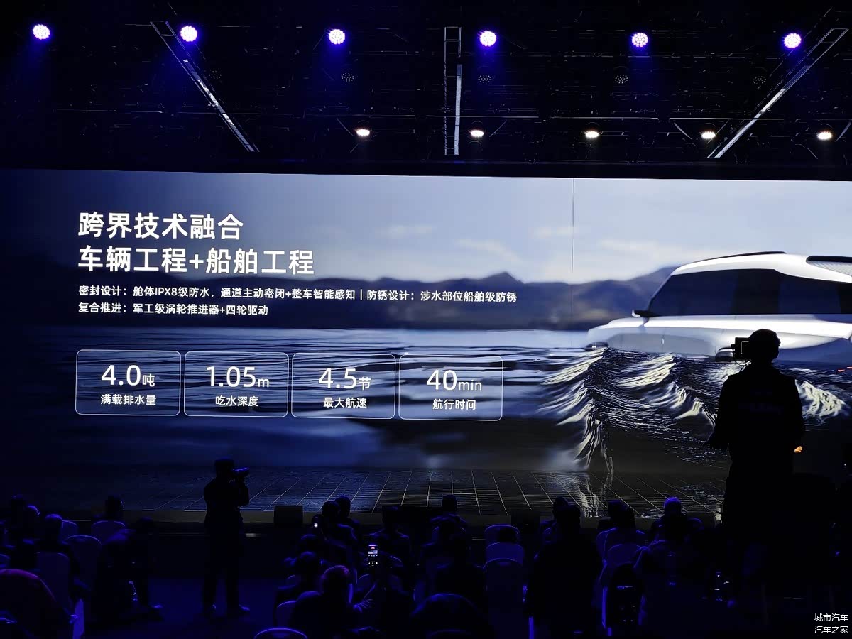 捷途纵横G900作为两栖车,全车采用IPX8级防水舱体,并通过6轴陀螺仪保持车身姿态稳定,满载排水量4t,吃水深度1.05m,搭配800V涡轮推进器和四轮驱动的复合推进系统,可持续航行40min,最大航速4.5节。