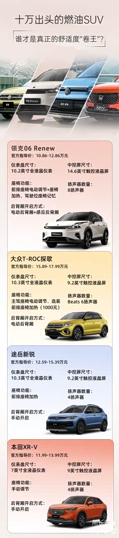 综上所述,这四款车型在10万出头的SUV市场中各有千秋。领克06凭借个性的设计和丰富的科技配置,深受追求时尚潮流和高科技的年轻消费者喜爱。途岳新锐以大气稳重的外观和可靠品质,坚守着传统实用主义的阵地。T-ROC探歌在硬朗的外观与丰富的内饰配置之间找到了完美的平衡。XR-V则依靠本田的口碑和实用设计,赢得了众多消费者的青睐。不知在这四款车型中,您更倾向于哪一款呢?