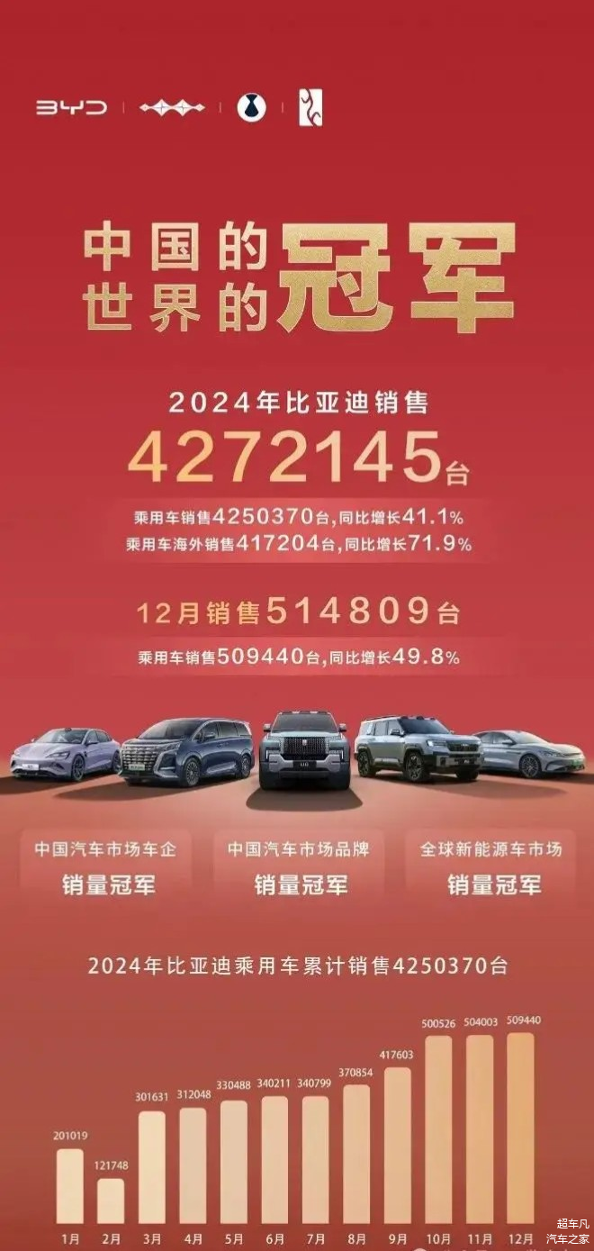 第一名,比亚迪,2024年12月比亚迪新能源汽车销量51.48万辆,2024年新能源汽车累计销量427.21万辆,同比增长41.26%。12月,比亚迪乘用车销量为50.94万辆,去年同期为34.02万辆,本年累计销量为425.04万辆,去年累计为301.29万辆,累计同比增长41.1%。