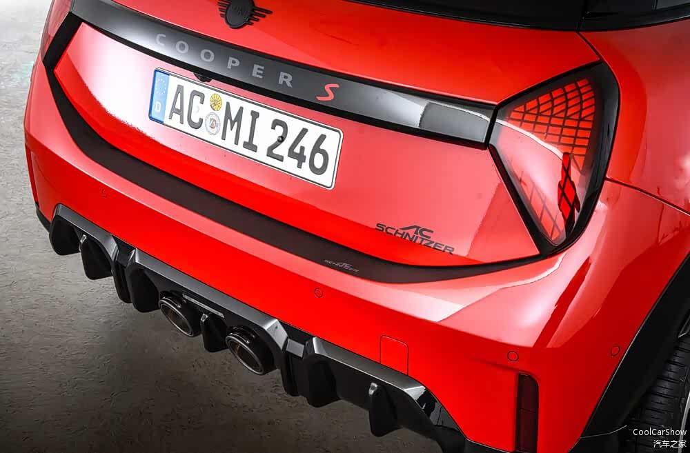 AC Schnitzer首先得“纠正”的就是这个排气,他们针对全新MINI设计了真正的中置布局的双出排气管,每个排气管直径高达 100 毫米,并配有碳纤维装饰件。PS.这是一个应该在原厂MINI就应该存在的细节。