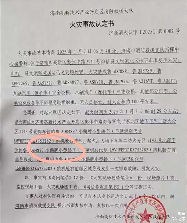 随后,有博主贴出一份海信贤文世家火灾事故认定书,由济南高新技术产业开发区消防救援大队出具,载明这一地下车库火灾造成9辆汽车(摩托车)完全烧损,8辆汽车(摩托车)严重烧损。