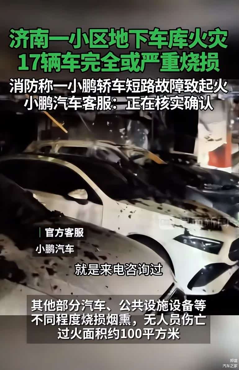 就在网友把矛头瞄准小鹏汽车,认为小鹏汽车部安全的时候。1月25日,小鹏汽车公关负责人@XP-阿莱克氏Alex 在微博发文回应“济南某小区地下车库火灾,17辆车完全或严重烧损”涉及小鹏汽车一事。