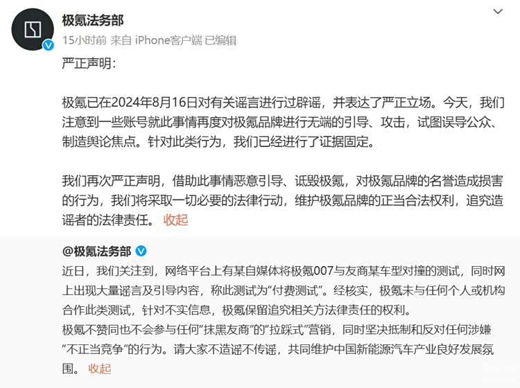 随后有些网友带节奏,宣称这条视频是极氪的付费测试。极氪法务部也是直接发出官方声明,极氪未与任何个人或机构合作此类测试,极氪不赞同也不会参与任何 " 抹黑友商 " 的 " 拉踩式 " 营销,坚决抵制和反对任何涉嫌 " 不正当竞争行为 " 针对不实信息,极氪保留追究相关方法律责任的权利。