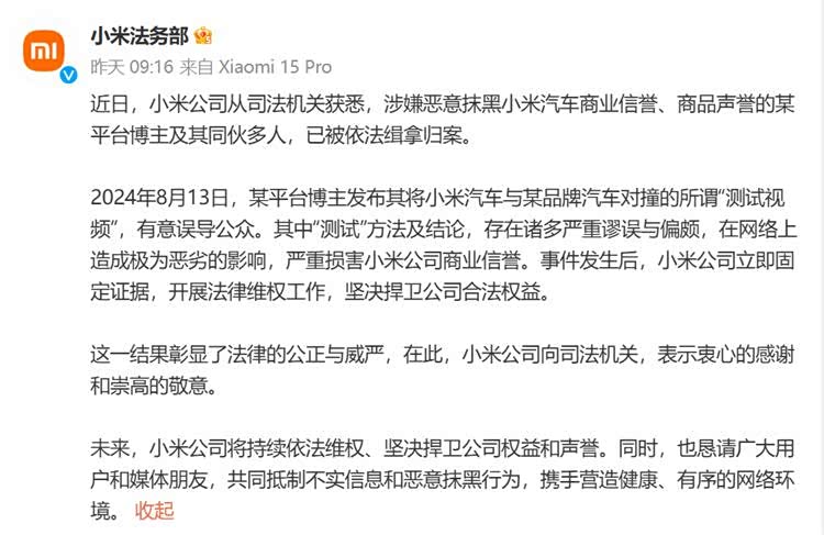 而昨天,小米法务部官方回应,因为涉嫌恶意抹黑小米汽车商业信誉、商品声誉,某平台博主及其同伙多人,已被依法缉拿归案。