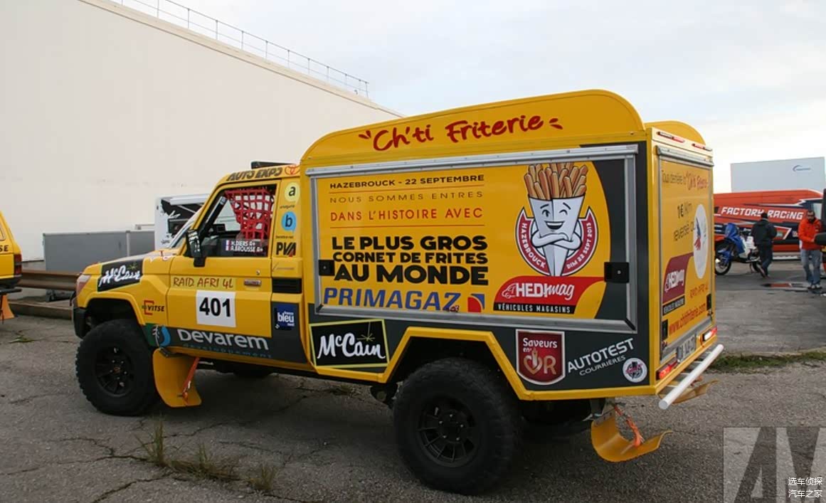 如果要选一台奇特的达喀尔拉力赛车,丰田薯条车是不二之选,比利时人埃尔韦·迪尔斯驾驶移动薯条车参加了达喀尔拉力赛。这辆车由200马力的丰田皮卡改装而来。当车队在第一阶段结束后到达露营地时,车手和副驾驶炸了 7 公斤薯条来,分给了营地的其他车手和机械师,最终以第58名的成绩完赛。