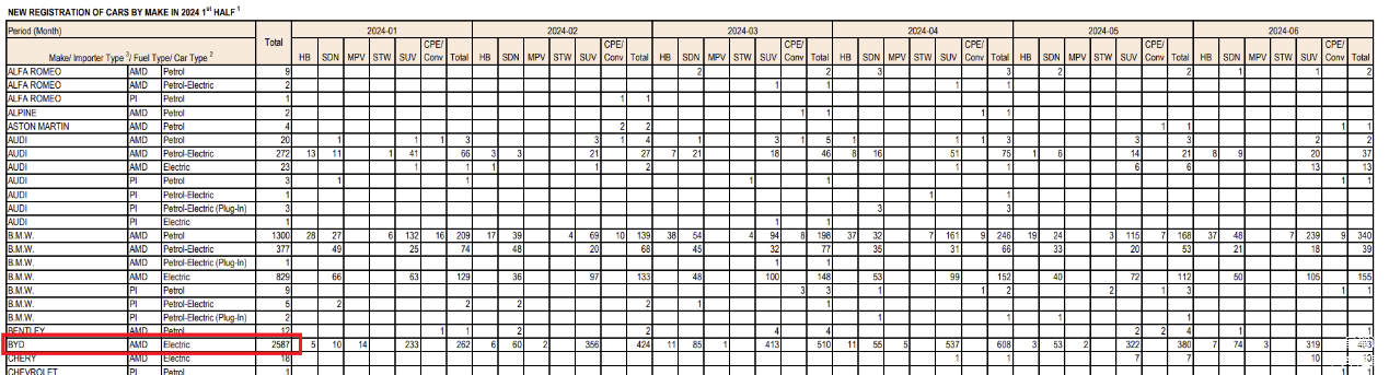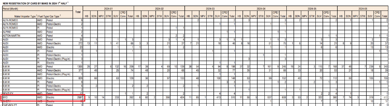 如上如【新加坡陆路交通管理局】公布所示,新加坡24年度比亚迪注册销量为6191辆!