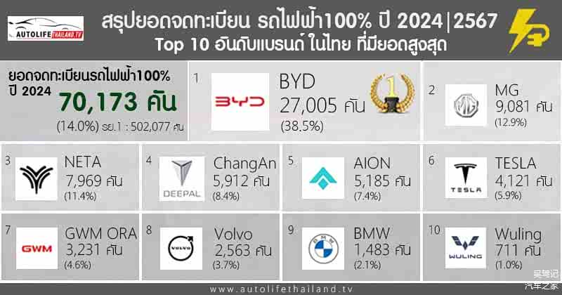 据泰国autolife thailand报道,1-12月,比亚迪Dolphin销量为13,386辆,位居电动汽车注册销量榜第1位。比亚迪Atto3销量为7,747辆,位居电动汽车注册销量榜第2位。比亚迪Seal销量为5,156辆,位居电动汽车注册销量榜第5位。